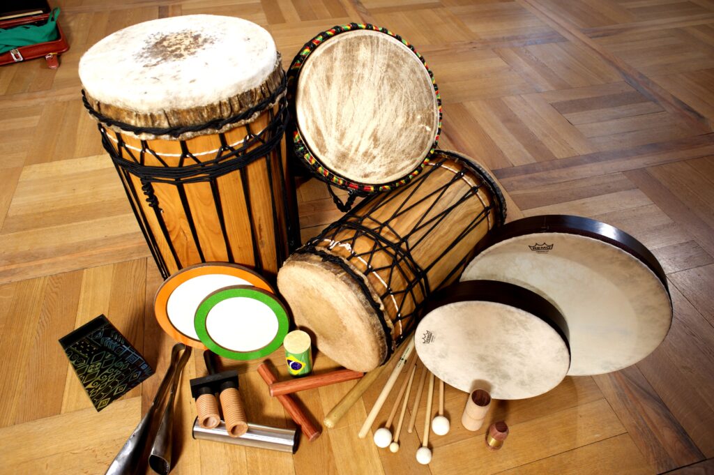 - Wir spielen auf Djemben, Basstrommeln, Kleinpercussion und ungewöhnlichen exotischen Instrumenten wie beispielsweise der westafrikanischen Schlitztrommel Krin oder den großen rasselnden Shekeres.
